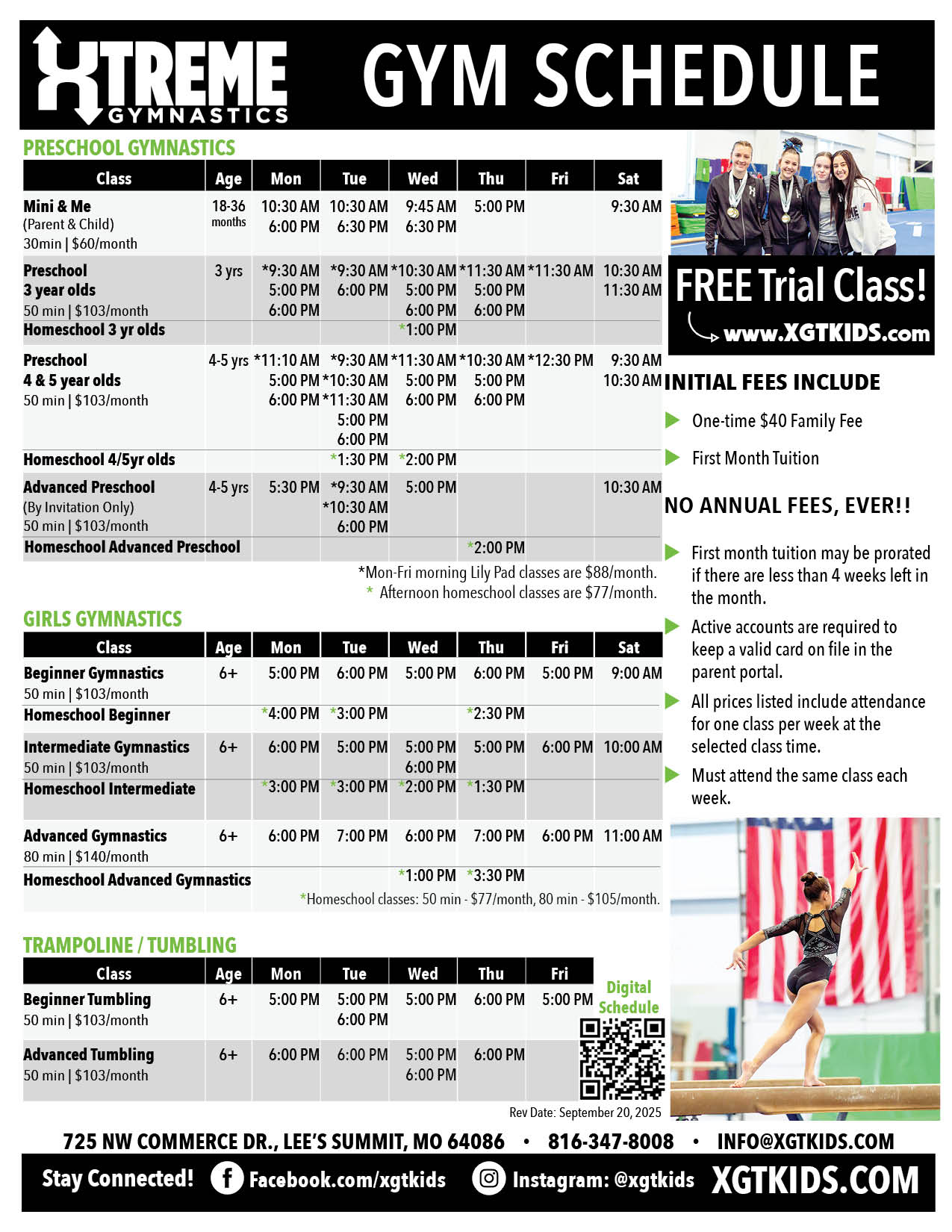 View our current class schedule to see which class best fits your interests and schedule. We have something for everyone here at Xtreme! Sign up for classes or a FREE TRIAL below!